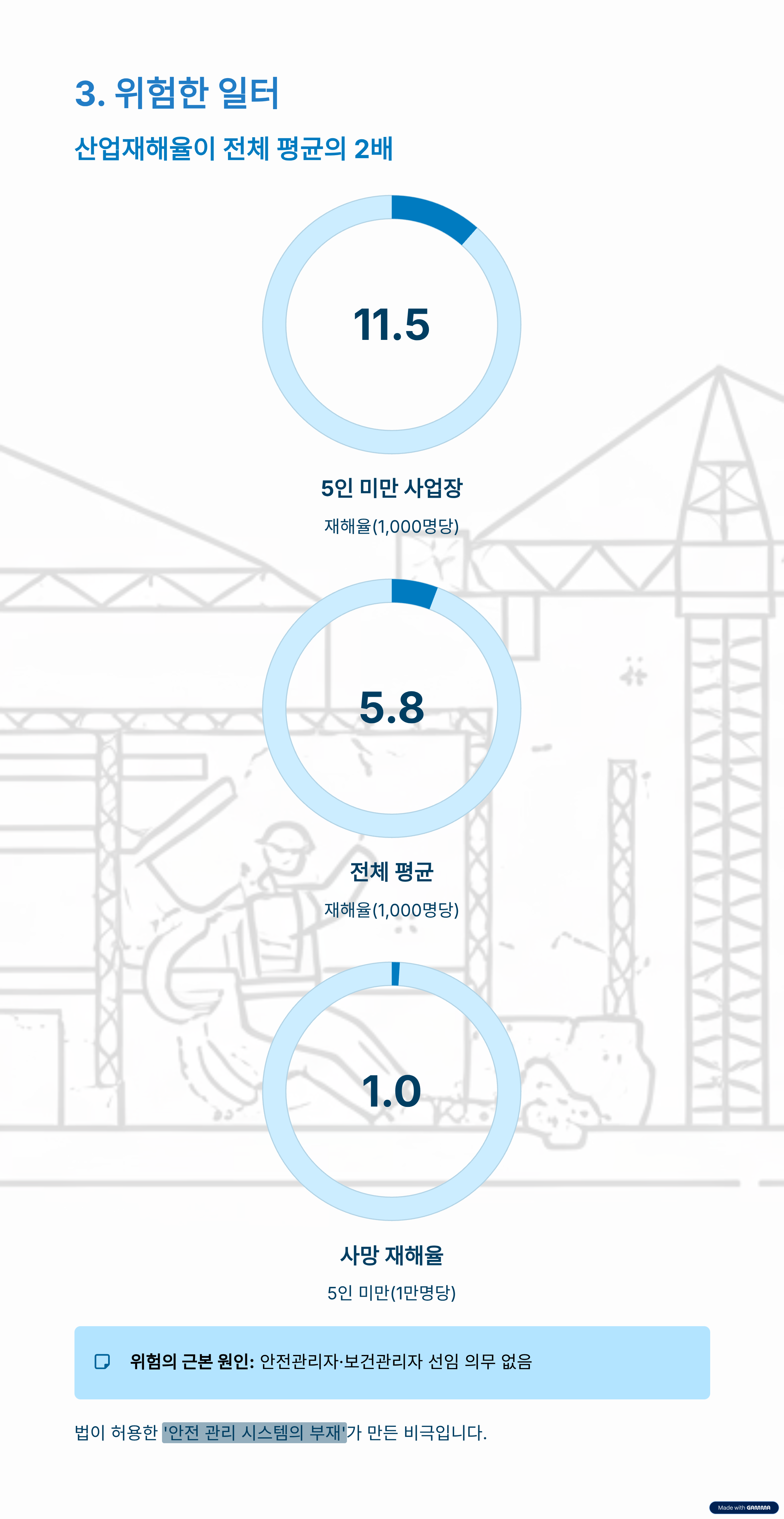 5인 미만 사업장의 산업재해율은 전체 평균의 거의 두 배에 달합니다. 이는 노동자의 건강과 생명에 직접적인 위협이 되고 있다는 명백한 증거입니다.