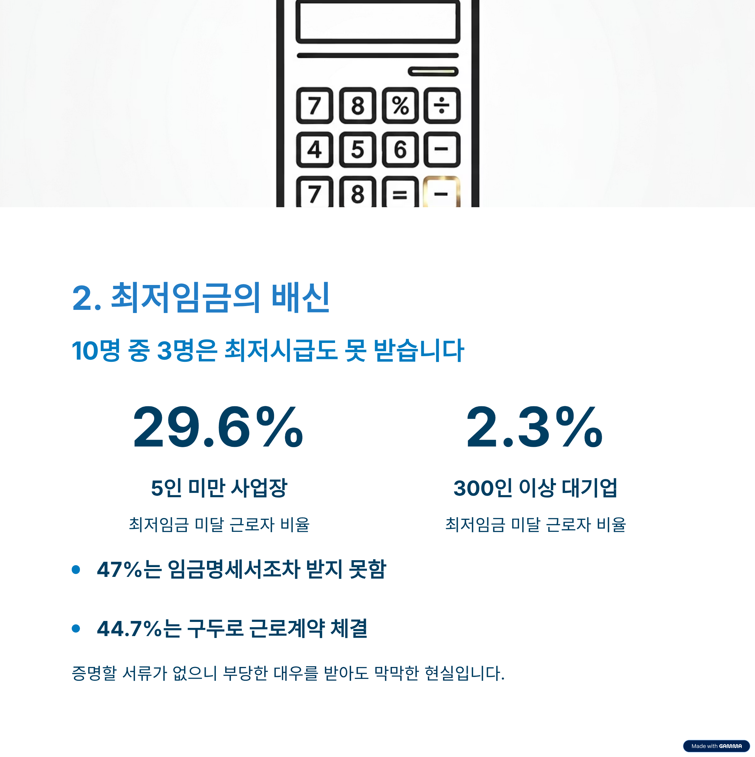 이러한 높은 위반율은 단순히 법을 지키지 않는 사업주만의 문제가 아닙니다. 전문가들은 연장·휴일근로 가산수당 적용 제외가 필연적으로 낮은 임금 구조를 만드는 '구조적 문제'라고 지적합니다. 문제가 여기서 그치지 않고, 열악한 노동환경 속에서 자신의 권리를 확인하고 주장하는 것조차 어렵습니다. 한 실태조사에 따르면, 5인 미만 사업장 노동자 중 47.0%는 임금명세서를 받지 못했고, 44.7%는 구두로 근로계약을 체결한 것으로 나타났습니다. 명확한 서류가 없으니 부당한 대우를 받아도 증명하기가 막막한 현실입니다.