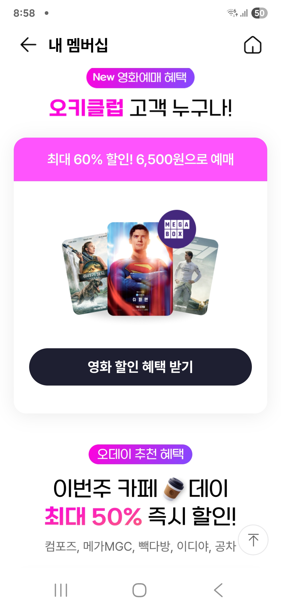 오키클럽 회원은 오데이 할인 외에도 다양한 혜택을 받을 수 있습니다. 대표적으로 '메가박스' 영화 예매 시 최대 60% 할인된 6,500원에 영화를 관람할 수 있는 혜택이 상시 제공됩니다. 최신 개봉작을 저렴하게 즐길 수 있는 좋은 기회이니 이 또한 잊지 말고 활용하시기 바랍니다.