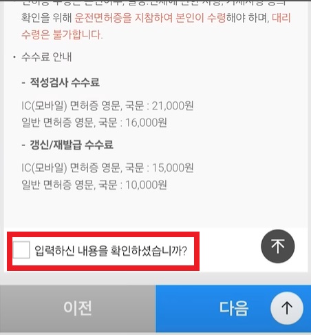 이용약관에 동의하면 적성검사 수수료와 갱신 수수료가 자동 표시됩니다. '수수료 안내를 확인하셨습니다"에 체크하여 주시고 면허증 분실여부 확인란에 본인의 면허증 여부를 확인 후 맞는 부분에 체크하여 주세요. 새로운 면허증을 받을 때 기존의 면허증을 반납해야 됩니다. 기존 면허증을 반납하지 않을경우 분실 재발급 수수료가 별도로 부과되는 점 참고 바랍니다.