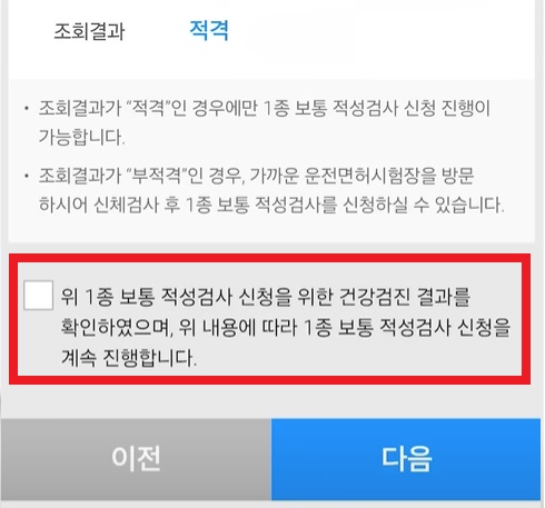 운전 적성 관련 질문(만성질환, 약물 복용 등)을 읽고 해당 사항에 체크합니다. 마지막에 **‘거짓이 아님을 증명합니다’**에 동의합니다.