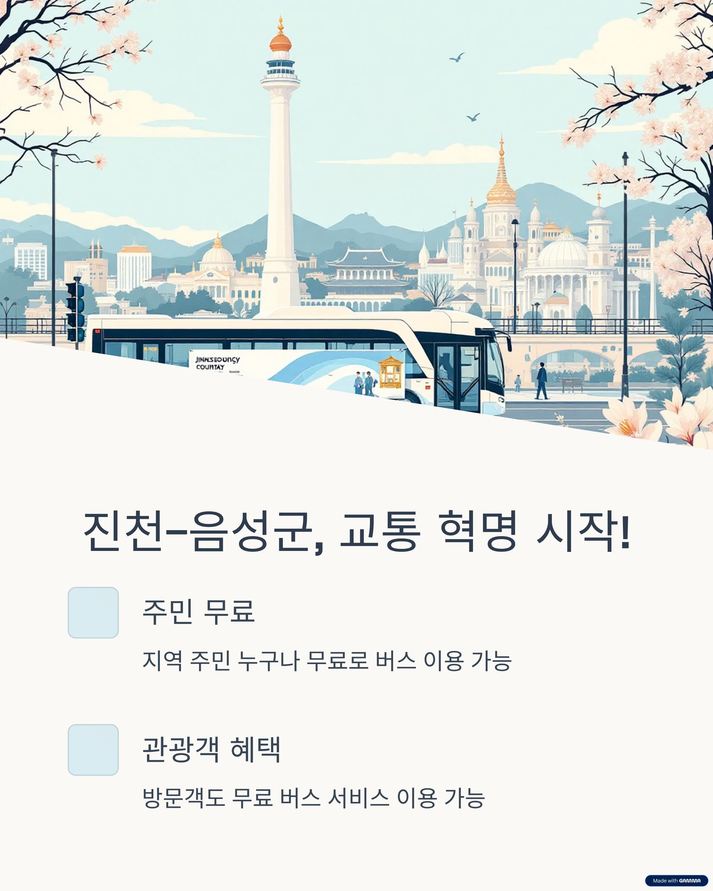 • 진천군 & 음성군: 모든 주민 및 관광객 대상 시내버스 전면 무료 (지역 내 및 두 지역 간 노선 포함)