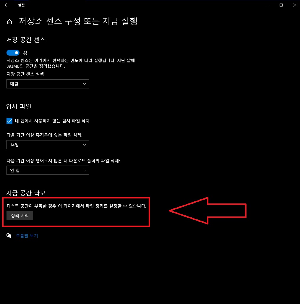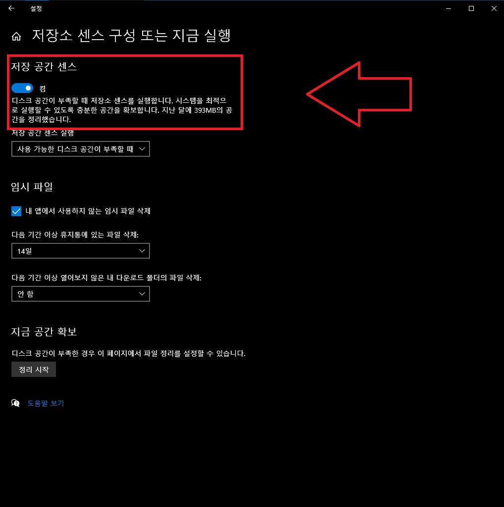 - ‘저장소 센스를 실행할 시기’ 클릭.