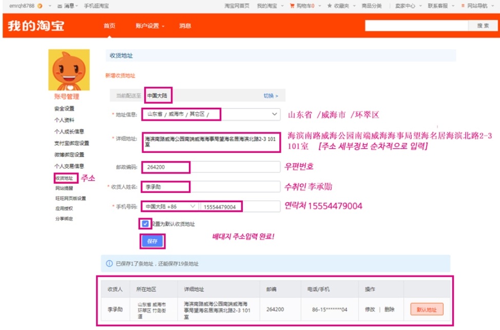타오바오를 이용하려면 중국 내 배송대행지(배대지) 주소를 입력해야 합니다. 하지만 주소 입력 페이지는 온통 중국어로 되어 있어 처음 접하는 사용자를 당황하게 합니다.