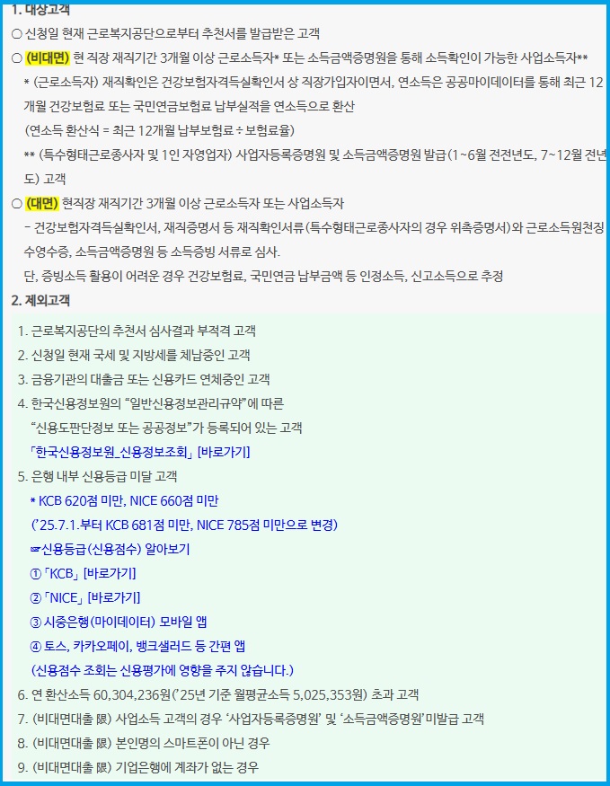 • 기업은행 내부 신용등급 미달자: KCB 620점 미만, NICE 660점 미만인 경우 대출이 불가합니다. (단, 2025년 7월 1일부터 기준이 KCB 681점 미만, NICE 785점 미만으로 변경될 예정입니다.)