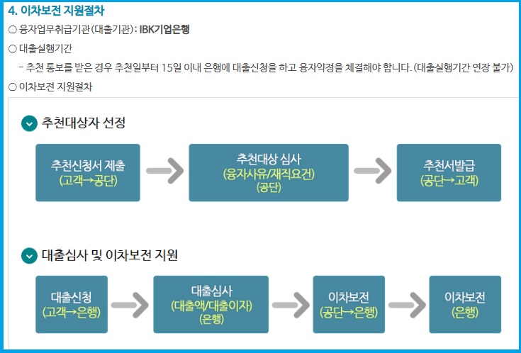 • 융자 조건: 1년 거치 후 3년 또는 4년간 매월 원금을 균등하게 분할 상환하는 방식 중 선택할 수 있습니다. 정부의 이차보전 지원을 통해 개인 신용대출 금리에서 최대 3% p까지 이자를 지원받게 됩니다.