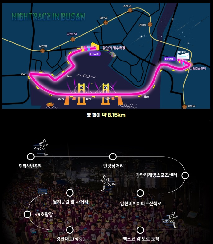 • 행사장소: 집결지는 광안리 해수욕장이며, 피니시 라인은 벡스코입니다.