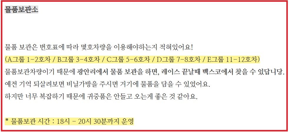 행사 당일 광안리 해수욕장 출발지에서 물품 보관 차량을 운영합니다. 물품 접수는 오후 8시 30분에 마감되며, 보관된 물품은 피니시 라인인 벡스코로 이동됩니다. 또한, 주최 측에서 제공하는 공식 번호표를 반드시 가슴에 부착해야만 레이스에 참여할 수 있습니다. 번호표를 훼손하거나 미부착 시 참가가 제한되며, 사고 시 불이익을 받을 수 있습니다.